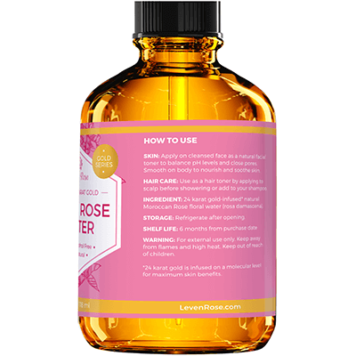 - PURE 24 KARAT GOLD MOROCCAN ROSE WATER - Cleopatra was said to use gold face masks nightly to preserve her beautiful skin. Leven Rose Gold Rose Water is perfect for toning face, neck, décolletage, eye area, dry skin, body and hair for balancing PH, acne prone skin, age spots, dark marks, combination oily skin, and overall balance skin as a botanical astringent and toner. Made from rose flowers and GOLD for a powerful natural toner - natural reducer of redness and a leader in liquid toners.