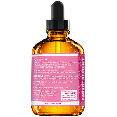 - JUST ONE INGREDIENT - Unrefined, cold-pressed, virgin Carrot Seed Oil (daucus carota) from Egypt is vegan friendly and has gone through NO animal testing - cruelty free! DARK AMBER BOTTLE preserves the organic pure oil by protecting against UV rays. Store in a cool dry place, out of direct sunlight. Leven Rose Carrot Seed Oil shelf life is 1 year from purchase date.